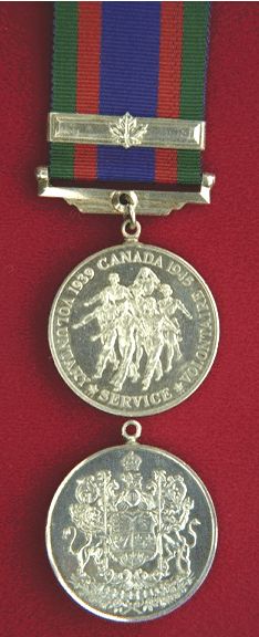 The Canadian Volunteer Service Medal is granted to persons of any rank in the Armed Forces of Canada who voluntarily served on Active Service and have honourably completed eighteen months (540 days) total voluntary service from September 3, 1939 to March 1, 1947. A silver bar (often called a clasp), a maple leaf at its centre was awarded for 60 days service outside Canada. A silver maple leaf is worn on the ribbon in undress.
