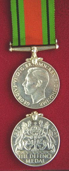 The Defense Medal awarded to Canadians for service in areas subjected to air attack or closely threatened, providing such service lasted for three or more years. Service overseas or outside the country of residence, providing that such service lasted for one year, except in territories threatened by the enemy or subject to bomb attacks, in which case it was six months prior to 02 September 1945. Those awarded the GC or GM for civil defense received this medal. The light green ribbon is 1.25 inches wide with a central stripe of orange (0.5" wide) and a narrow black stripe in the middle of each green stripe. The orange (flame colour) represents the enemy attacks on the green land of England and the black represents the black-outs. This is a circular, silver (.800 fine) medal, 1.42 inches in diameter. There were 325,000 Defense Medals issued.
