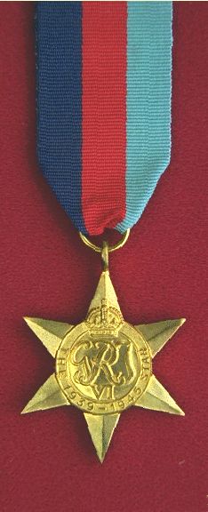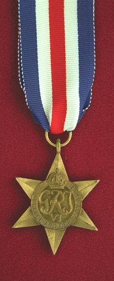 The 1939-1945 Star was awarded for active armed forces operations service between 02 September 1939 and 08 May 1945 (Europe) or 02 September 1945 (Pacific). The ribbon consists of three equal stripes: dark blue, red, and light blue (representing the navy, army and air force). There were 305,000 1939-1945 Stars issued.