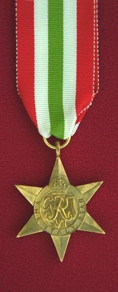 The Italy Star was awarded for operational service in Sicily or Italy between 11 June 1943 and 08 May 1945. The ribbon consists of equal stripes of red, white, green, white, and red. The colours represent the colours of the Italian flag. There were 91,000 Italy Stars issued.