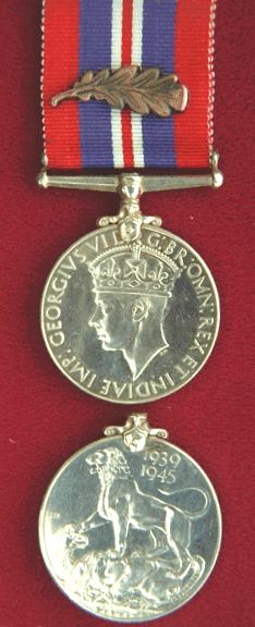The War Services Medal 1939-1945 was awarded to all full-time personnel of the armed forces and merchant marines for serving between 03 September 1939 and 02 September 1945. A single bronze oak leaf emblem is worn to signify a Mention-in-Dispatches and the silver oak leaf signifying a King's Commendation for Brave Conduct is worn on this medal. The ribbon is 1.25 inches wide and consists of 7 coloured stripes: red, dark blue, white, narrow red (centre), white, dark blue, and red. This is a circular, (.800 fine) silver medal, 1.42 inches in diameter. There were 700,000 War Services Medals issued.