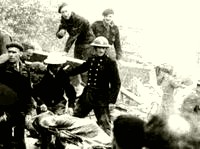 Landing in England Soon after arriving in London we were billeted with civilians where I got my first taste of the bombing. The bombers used to come at night. I'd never seen anything like it, the bombers banged London relentlessly, it was so bad, but after a while they became commonplace and we didn't seem to notice it. I suppose you can get used to anything if it happens often enough. Although, that first time I was there when they started pounding, "boom, boom" it was shocking. The explosion was way down the street, blew the whole street apart. They train you to get under cover. Everything shook and the two of us dove to the floor, underneath the sink I think. Imagine it, two grown men underneath the sink and there was our host, still up and walking around, you know, still fixing dinner! I was yelling at her to get down but she was so used to it, you know the bombers used to hit almost every night. She was just as calm as anything and we felt foolish, the two of us soldiers underneath the sink. So that was my first impression of war. It was the surprise that was scary. But you know, it made you wonder deep down inside, if we did that here in this woman's kitchen, crowding under the sink because of the noise, what the hell are we going to do when we get to the front?" You know, "What kind of a soldier am I gonna, be?" The truth is, you learn and become numb, it grows on you, and like our host you can get used to anything. After a while you just got the, the sounds, eh! When to duck, or jump, or we somehow knew when one was coming near, so forth and so on, eh, but it took a while to get used to it, eh. Even the sounds of the shells and that, you knew them, which were bigger ones, smaller ones, and you knew about how far away they were because it helped you to stay alive, eh. After a while you just, you did your job and you weren't doing anything out of the ordinary, so you, just did it, that's the way you went.